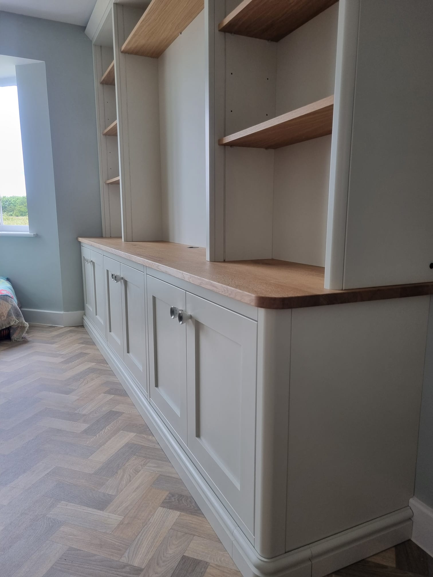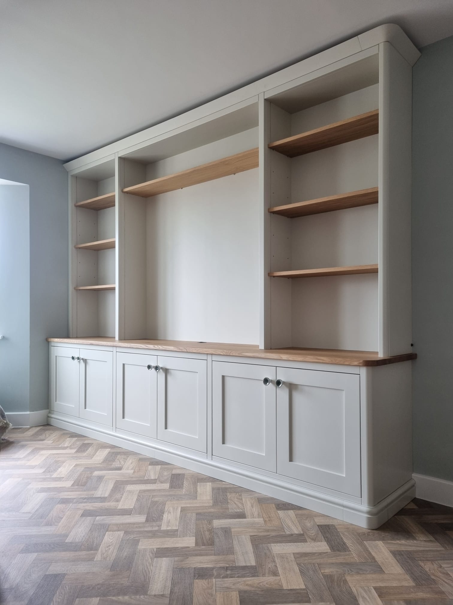 A large 3-metre media cabinet featuring a solid oak top and curved details, designed and fitted for a home in Botesdale.