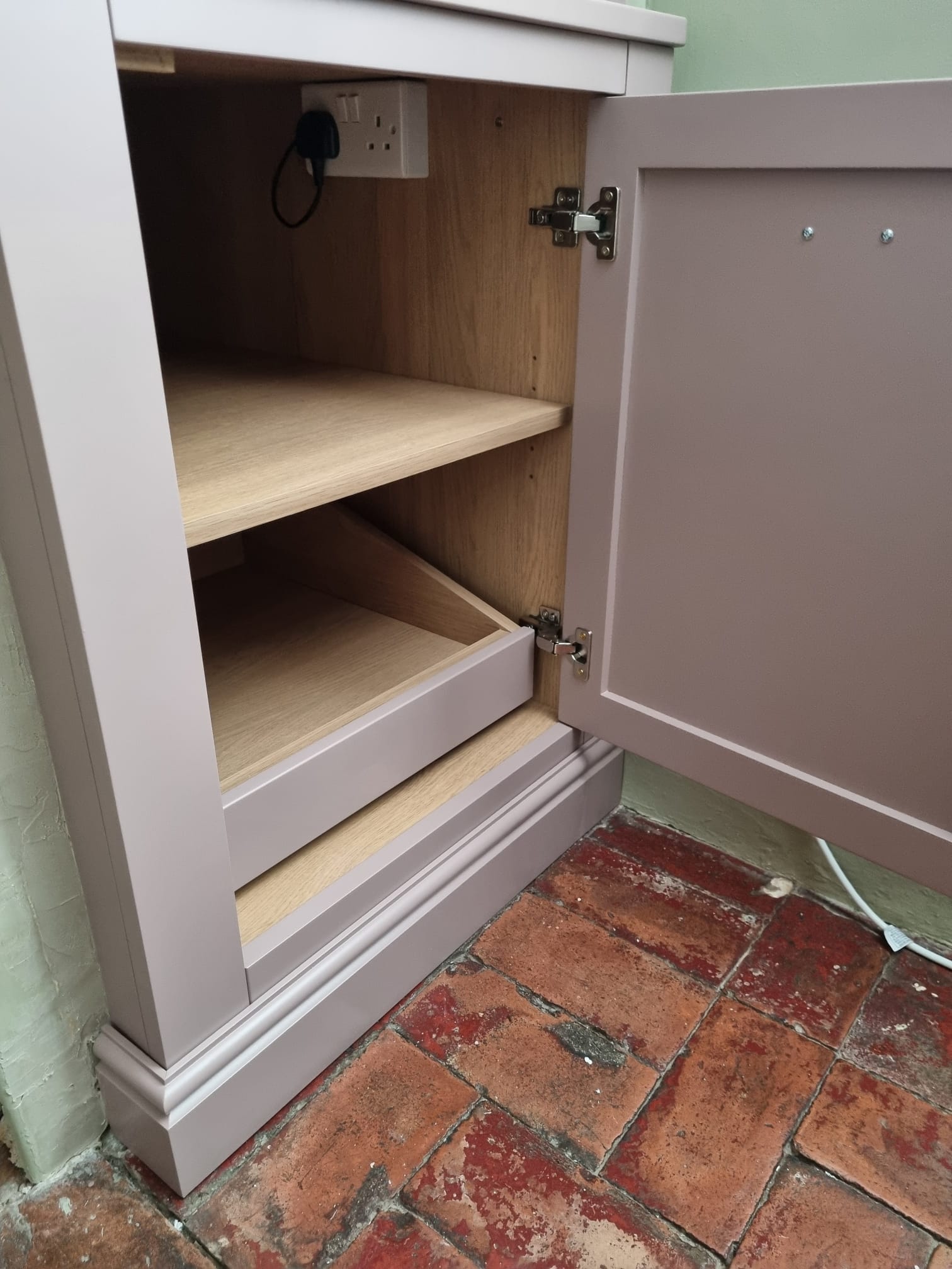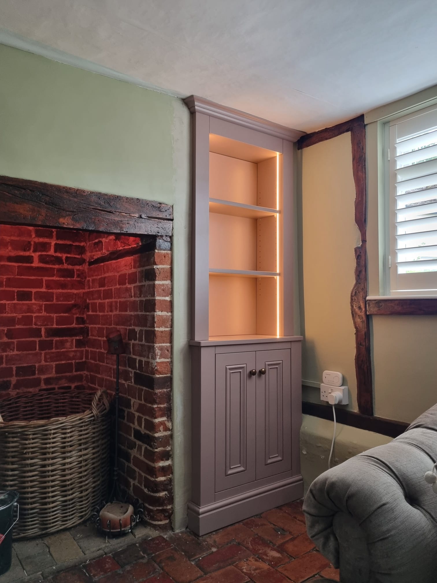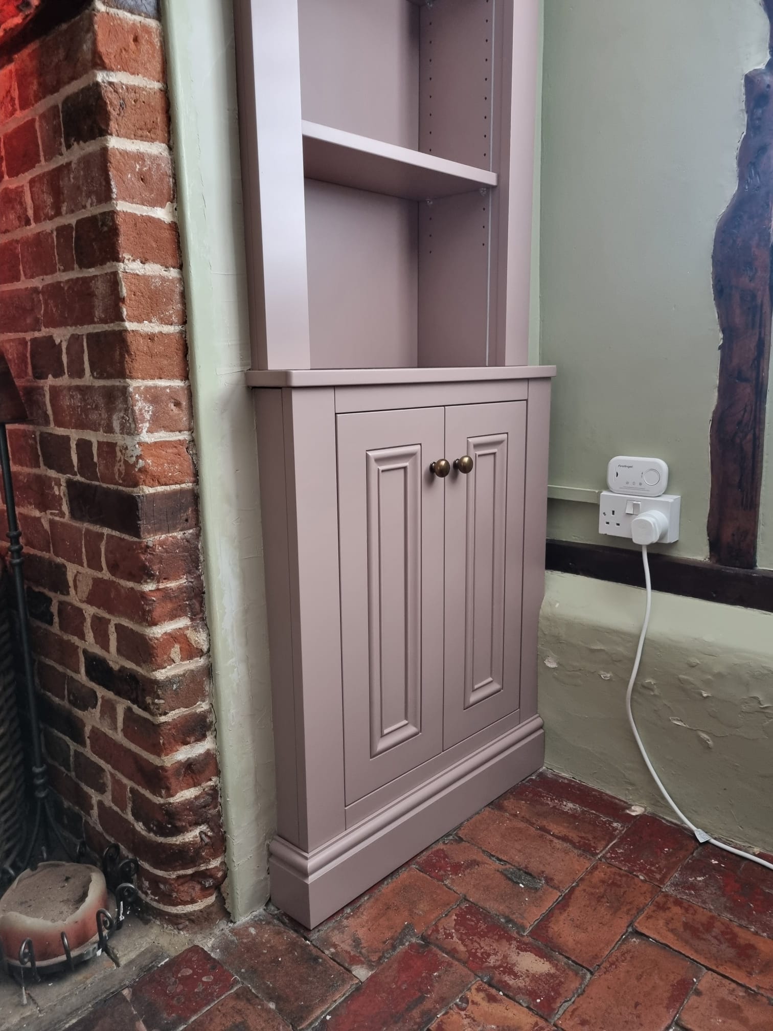 The cabinet was meticulously crafted in our workshop from high-quality materials to ensure a perfect fit. The entire unit was then professionally spray-finished in ‘Sulking Room Pink’ by Farrow & Ball. This sophisticated and warm muted rose gives the cabinet a powdery softness, turning a once-forgotten corner into a beautiful and stylish feature of the room.