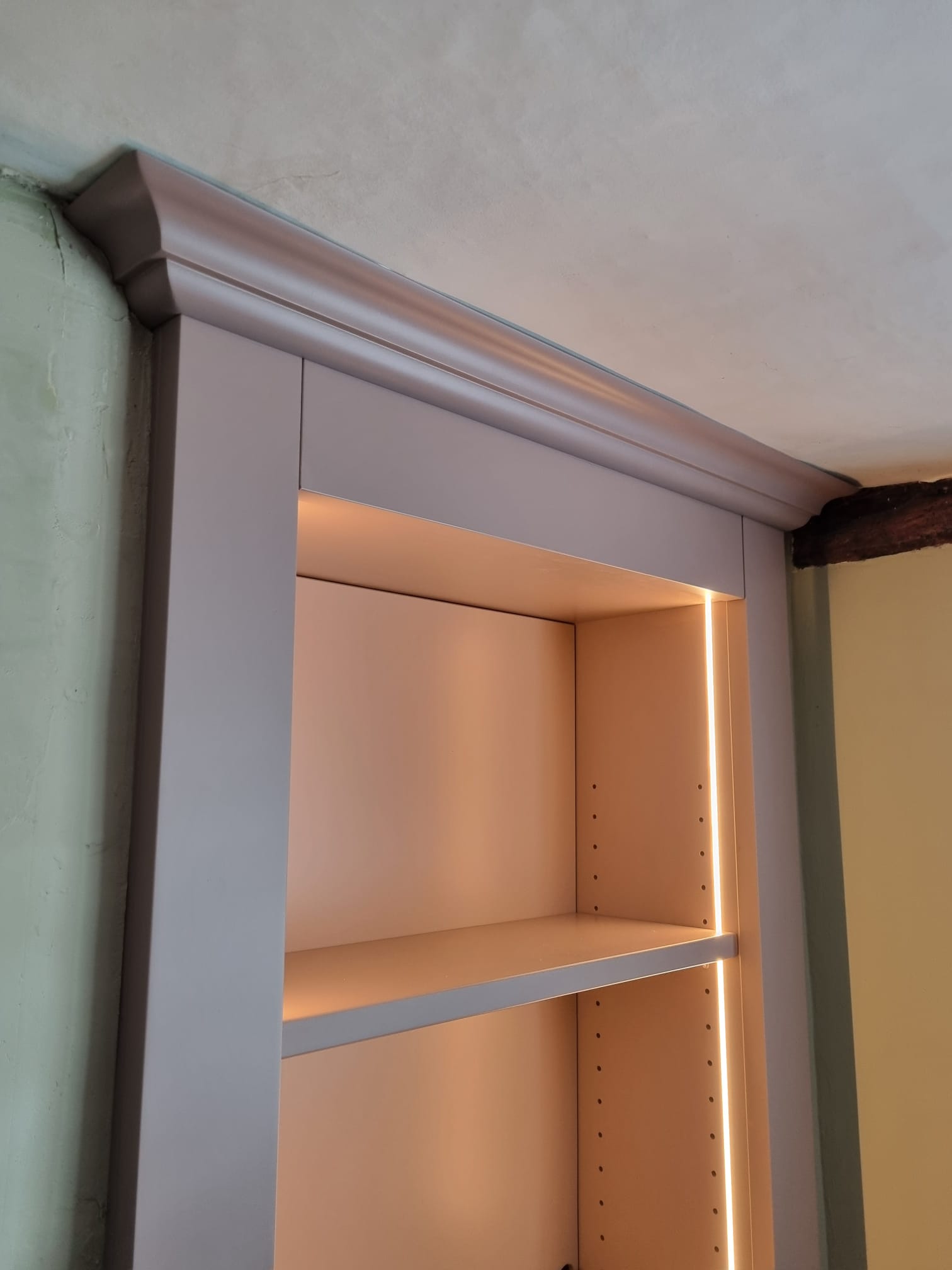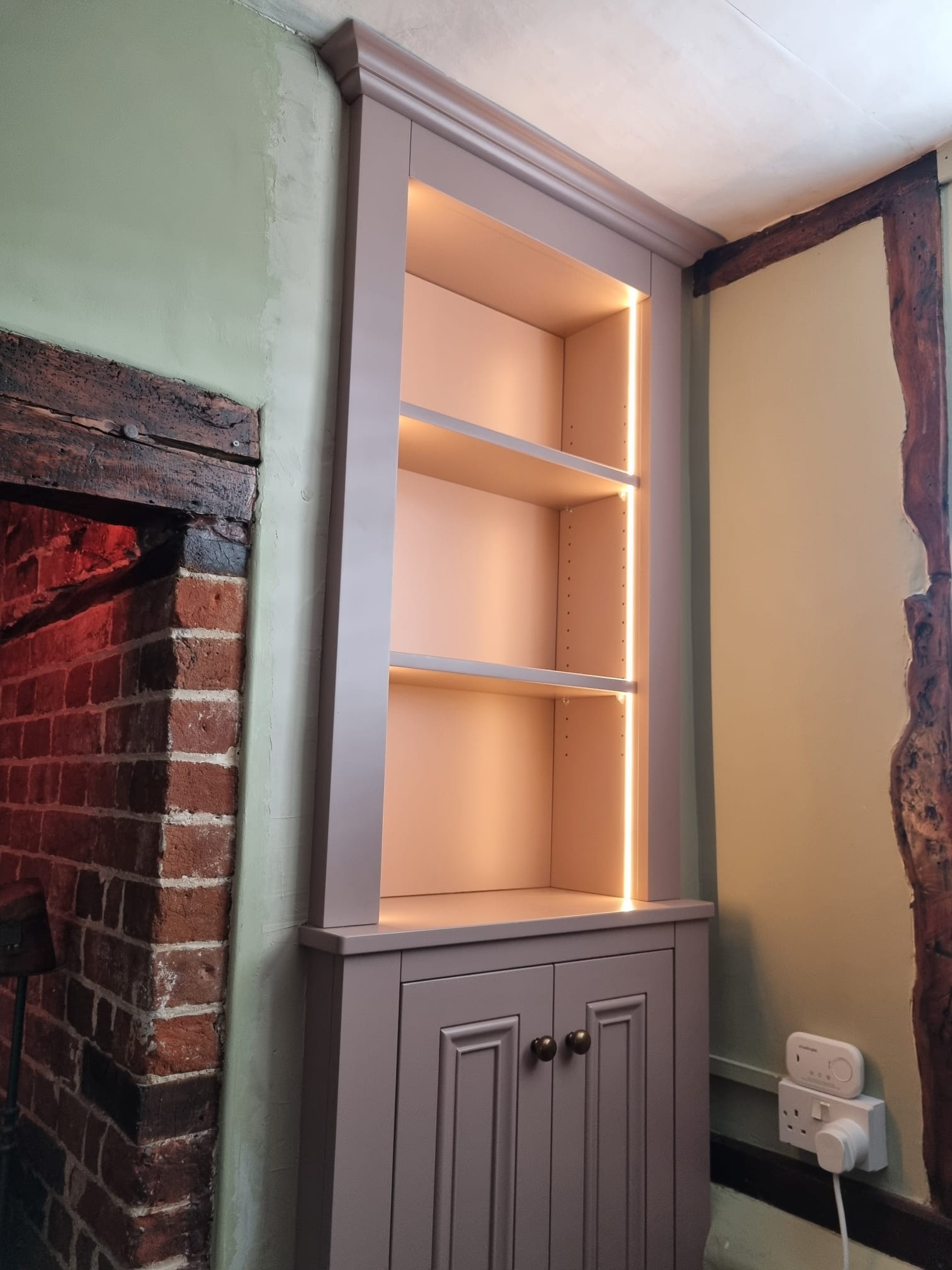 A modern alcove cabinet with clever hidden storage, designed to replace and upgrade an outdated cupboard for a client in Thetford.